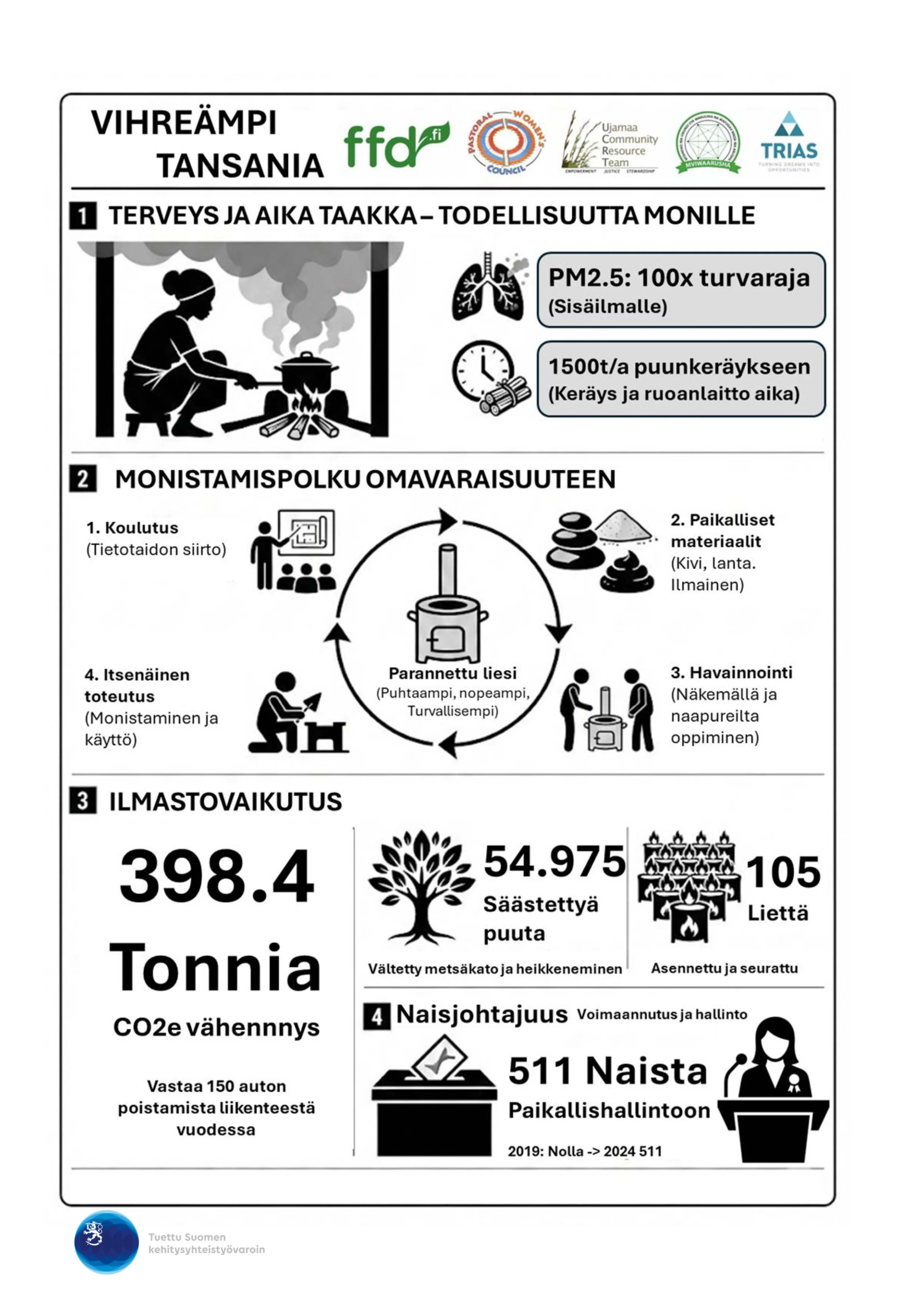 Pohjois-Tansanian laidunmailla aamun merkkinä on perinteisesti ollut sankka, pistävä usva. Vuosisatojen ajan maasai- ja meru-naiset aloittivat päivänsä "kolmen kiven nuotion" ääressä hengittäen sankkaa savua valmistellessaan perheelle ateriaa. Tänään usva on hälvenemässä. "Vihreämpi Tansania" -hankkeen (2023– 2026) myötä tavoitteena on korvata ruoanlaitto teknologialla, joka parantaa terveyttä, voimaannuttaa naisia ja samalla viilentää planeettaa.